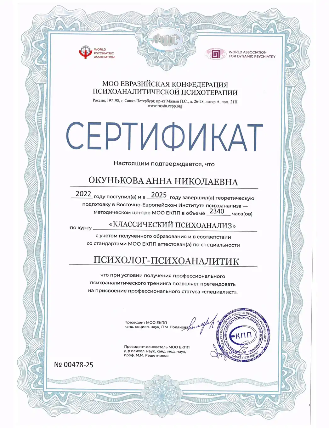 • 2015 - Институт экономики и управления в медицине и социальной сфере ( Диплом о профессиональной переподготовке по программе "Психология. Специализация - Клиническая психология")